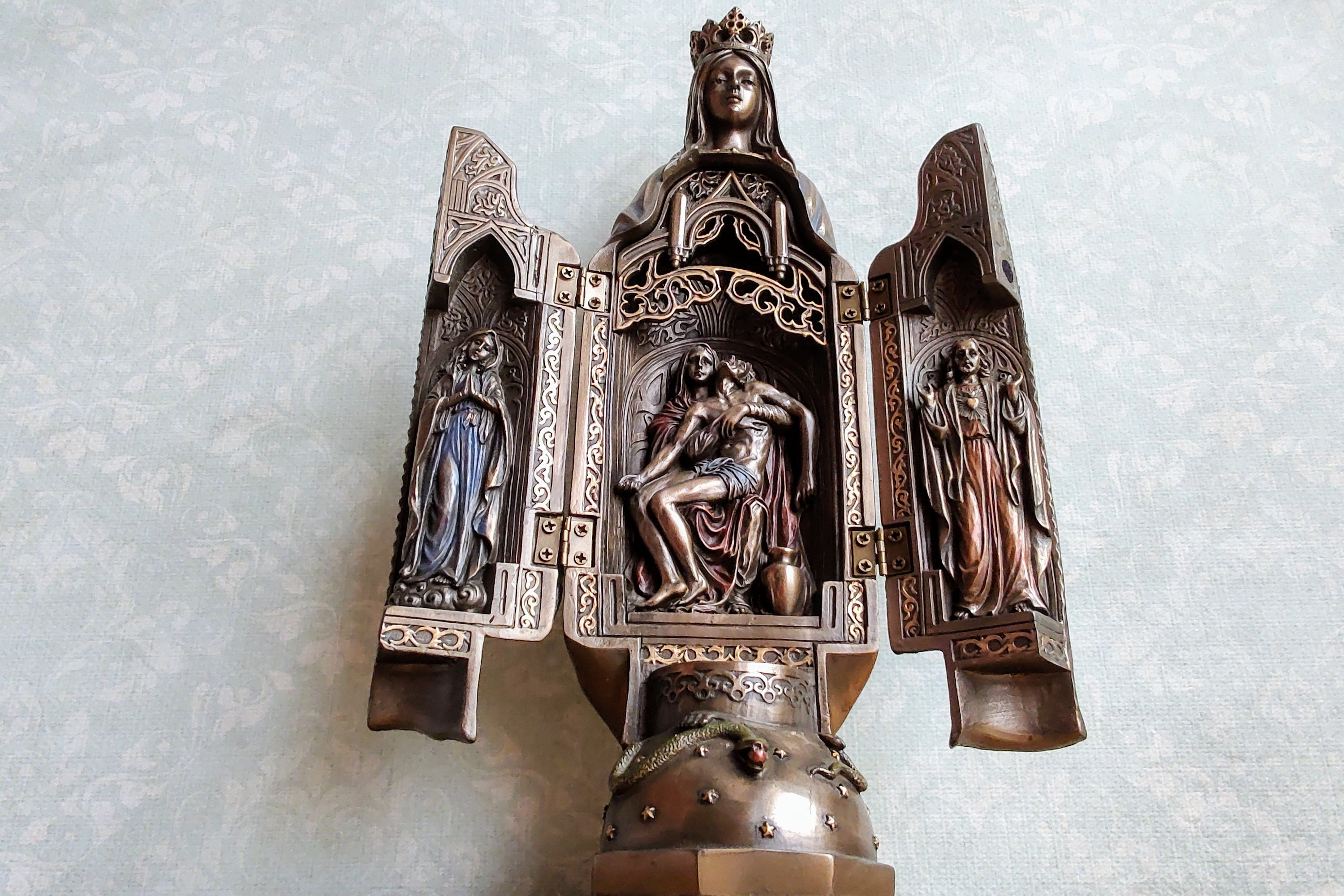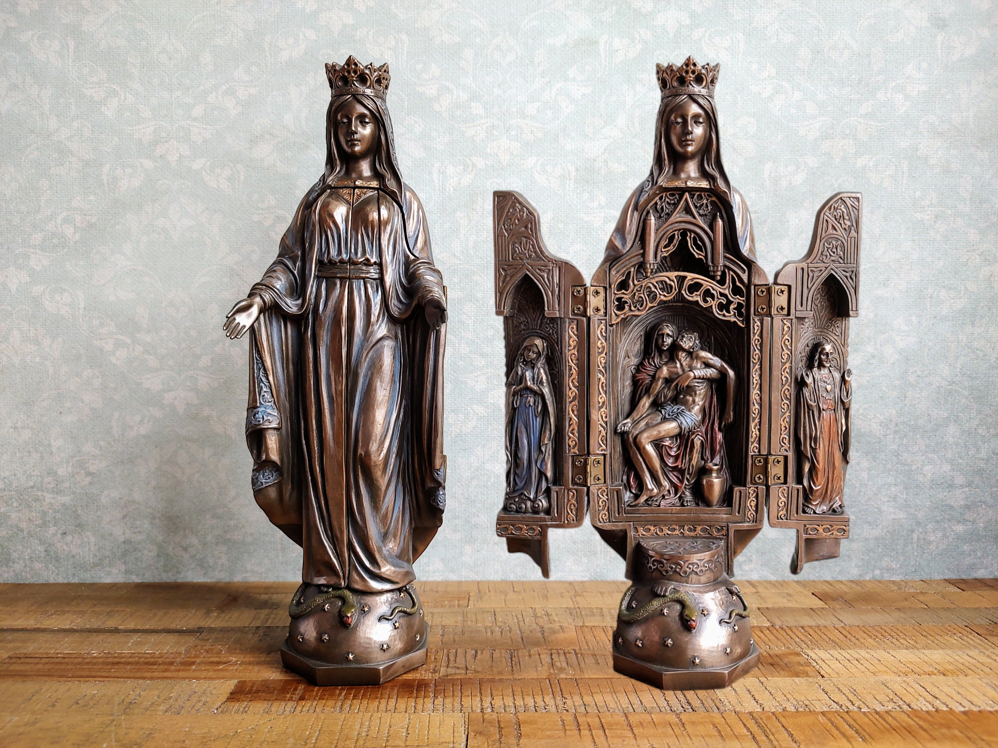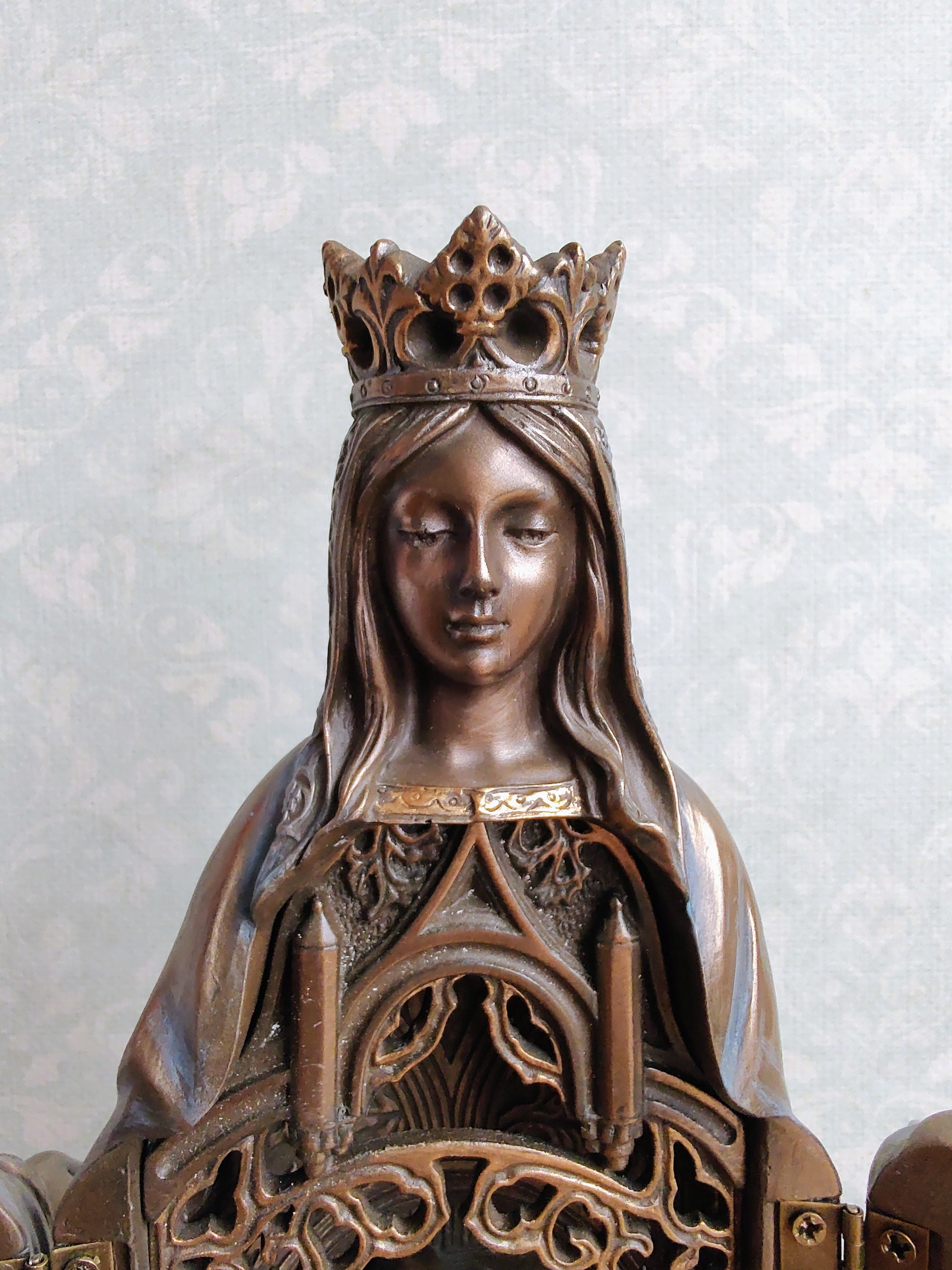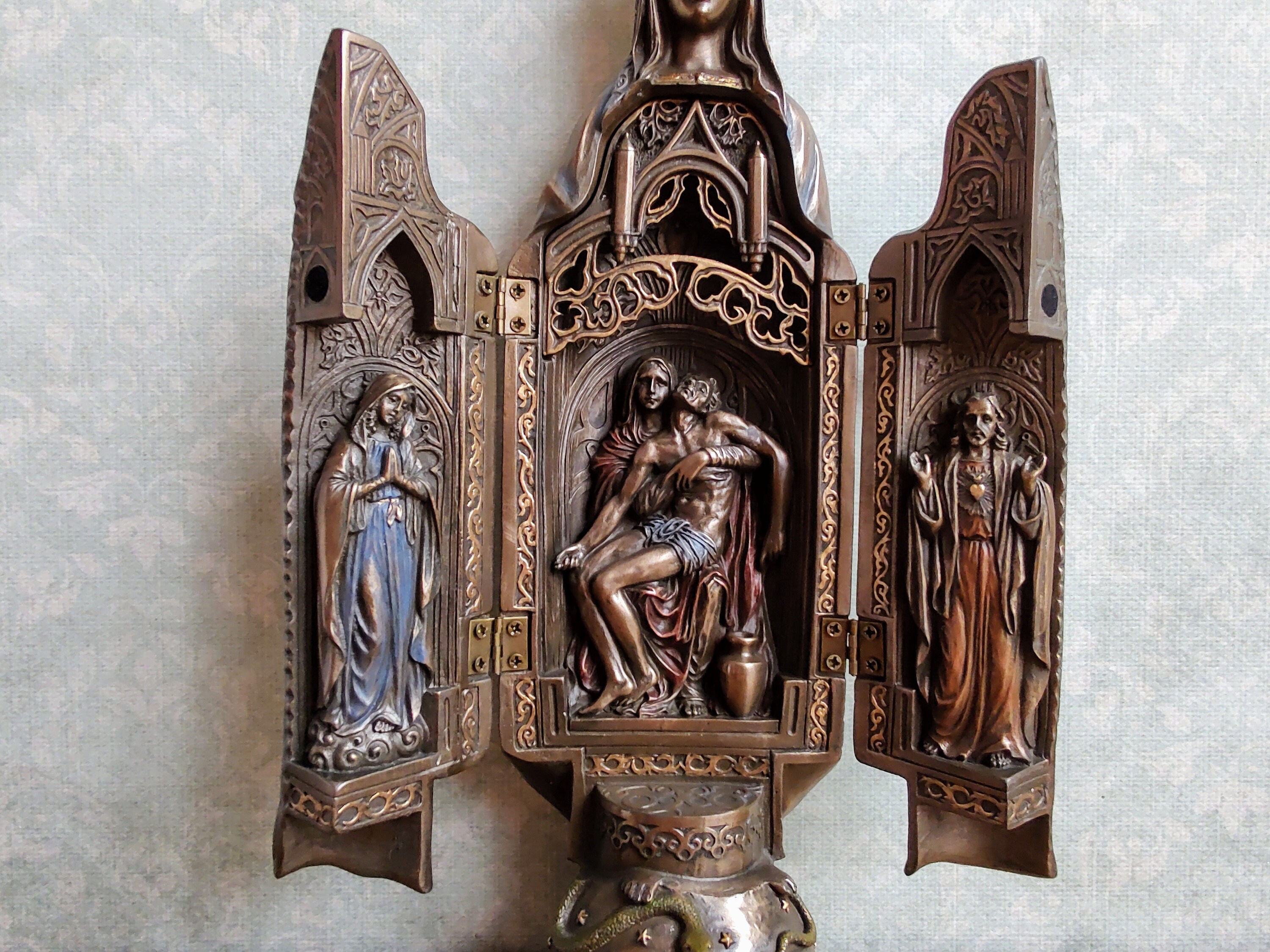 The finish gives it an antique, bronze-like look that radiates reverence and beauty.