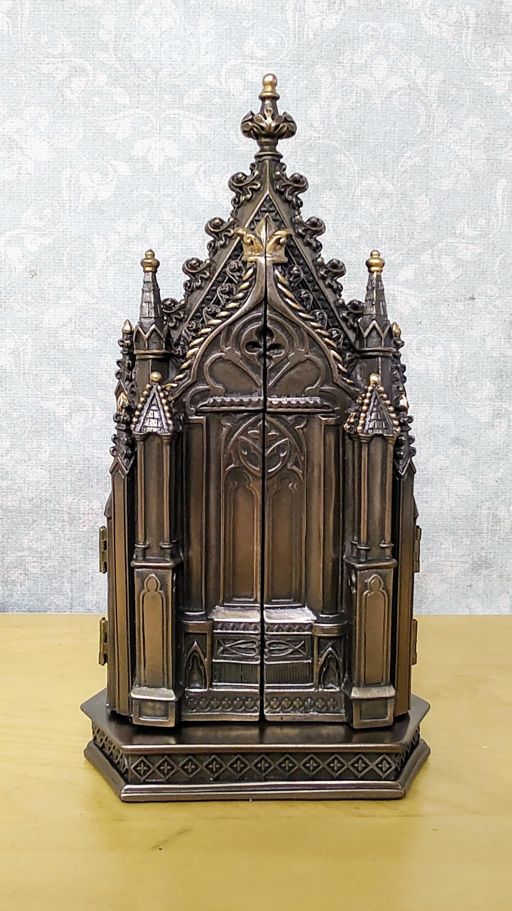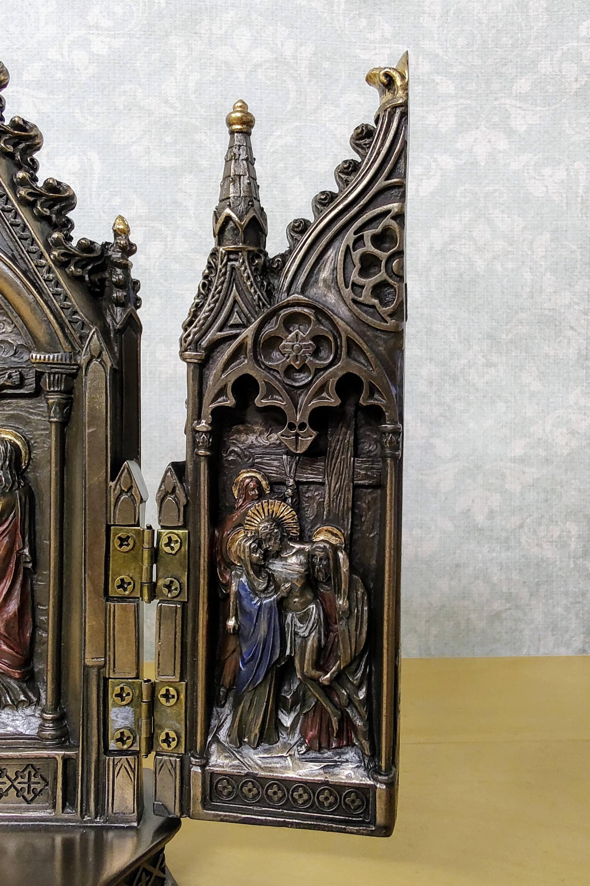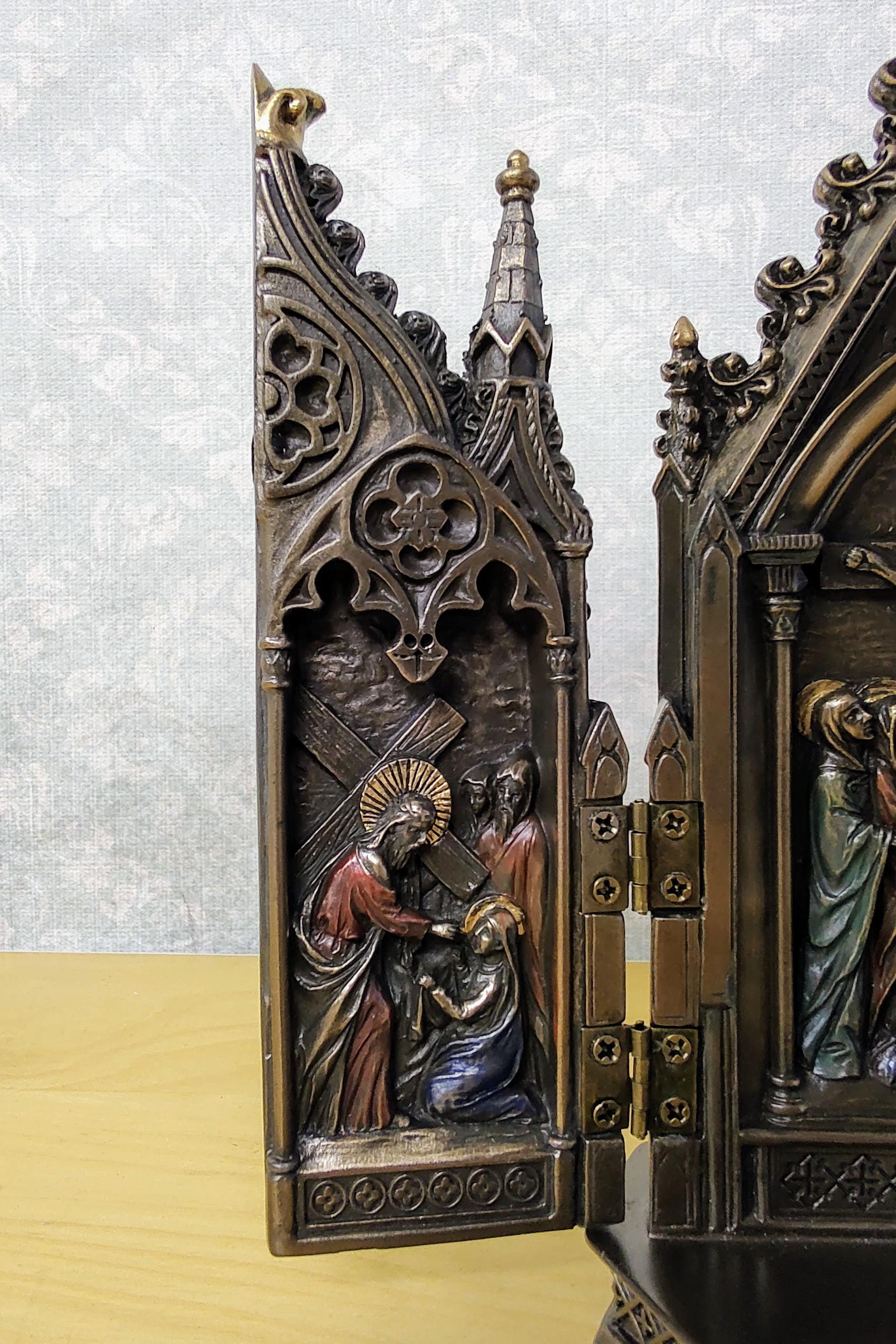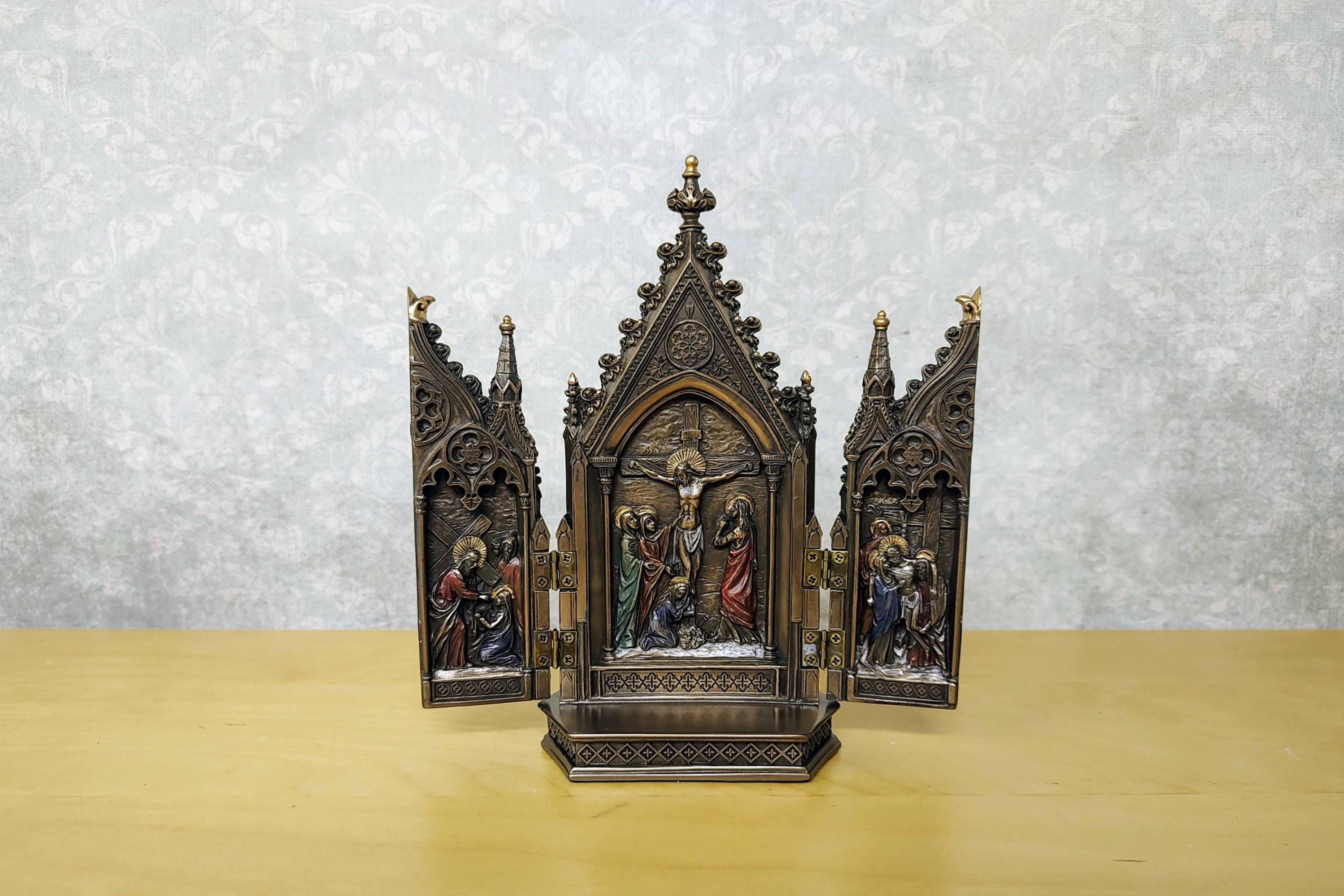 This intricately detailed bronze-finished cast resin Triptych features a body that opens to reveal a striking crucifixion scene, showcasing a unique and elaborate design. Hand-applied color accents further enhance its beauty.