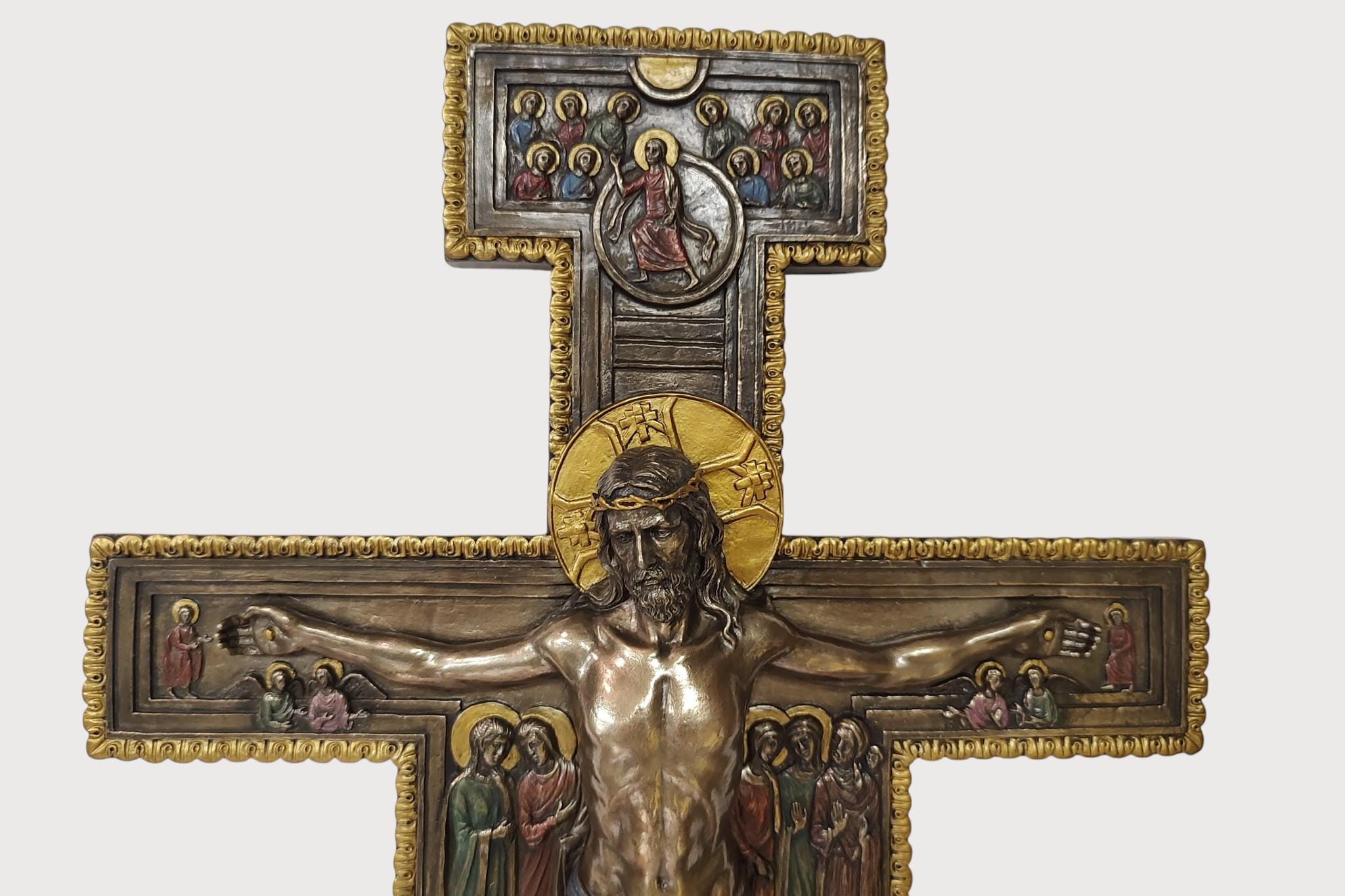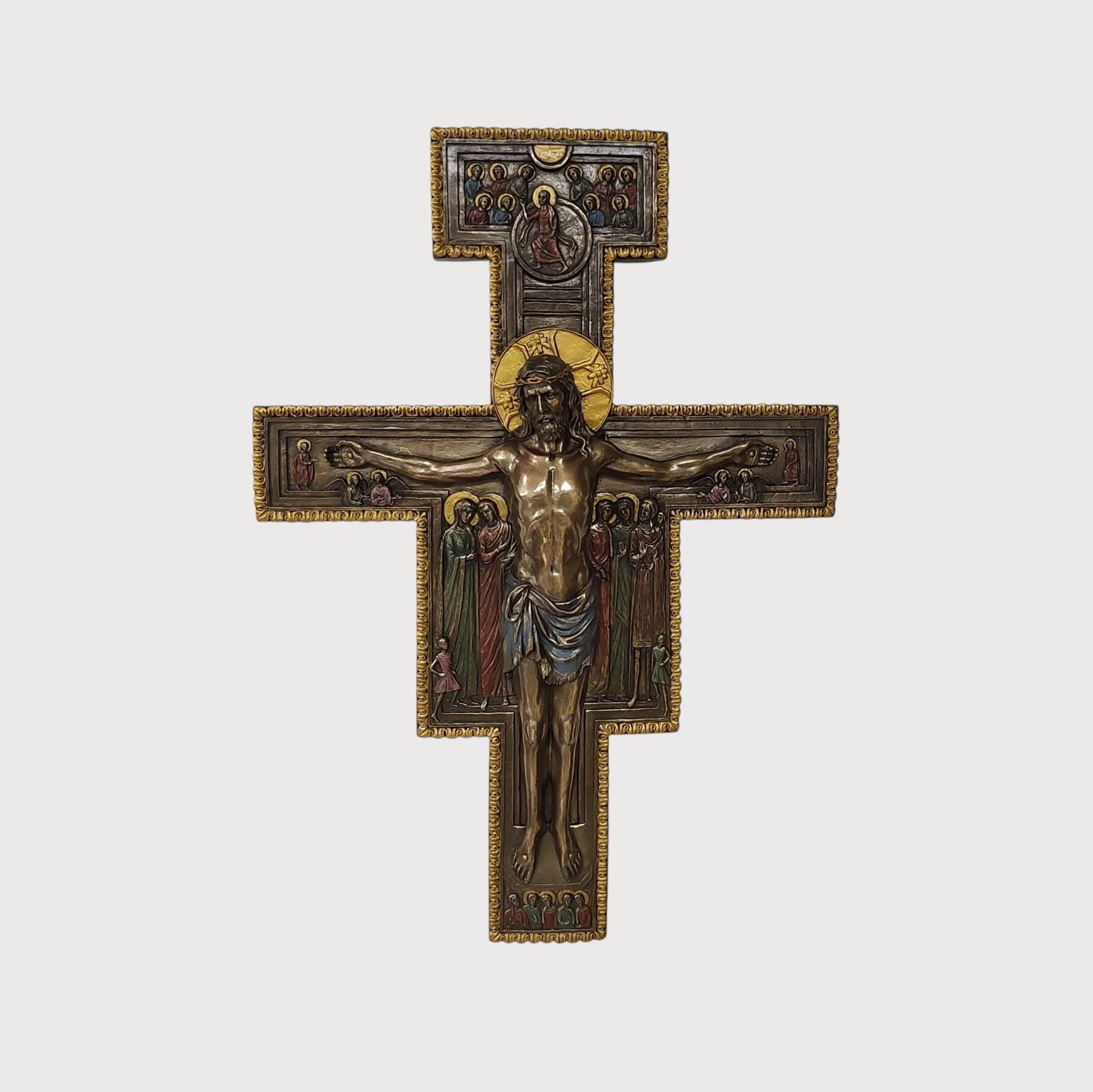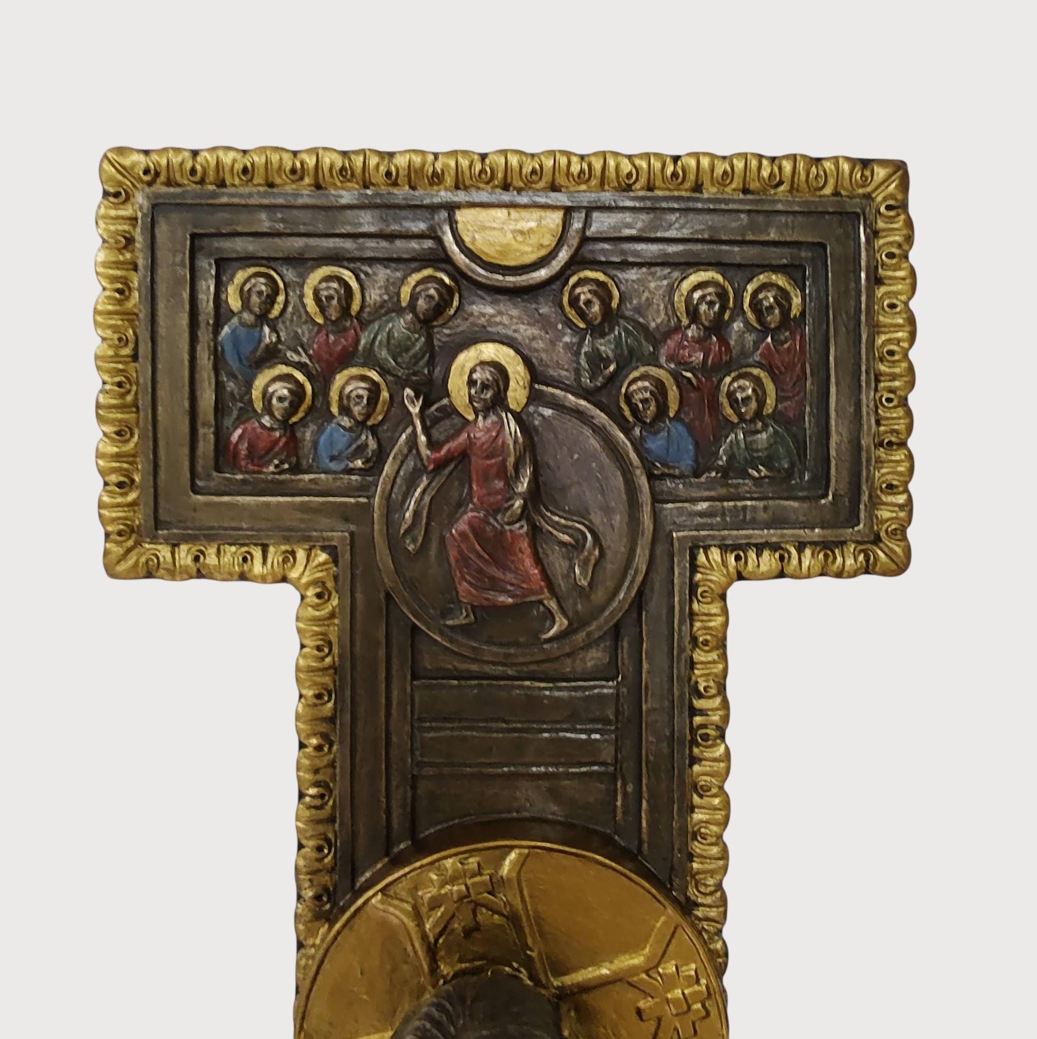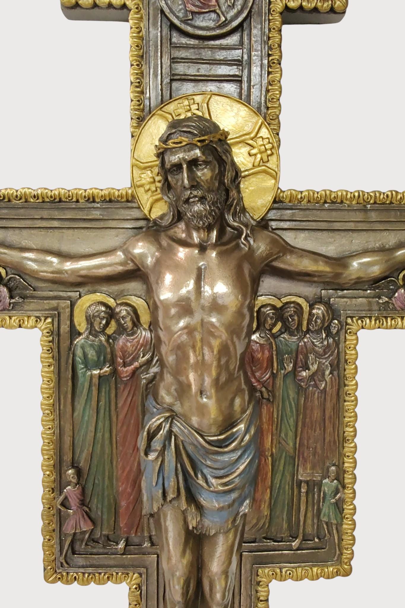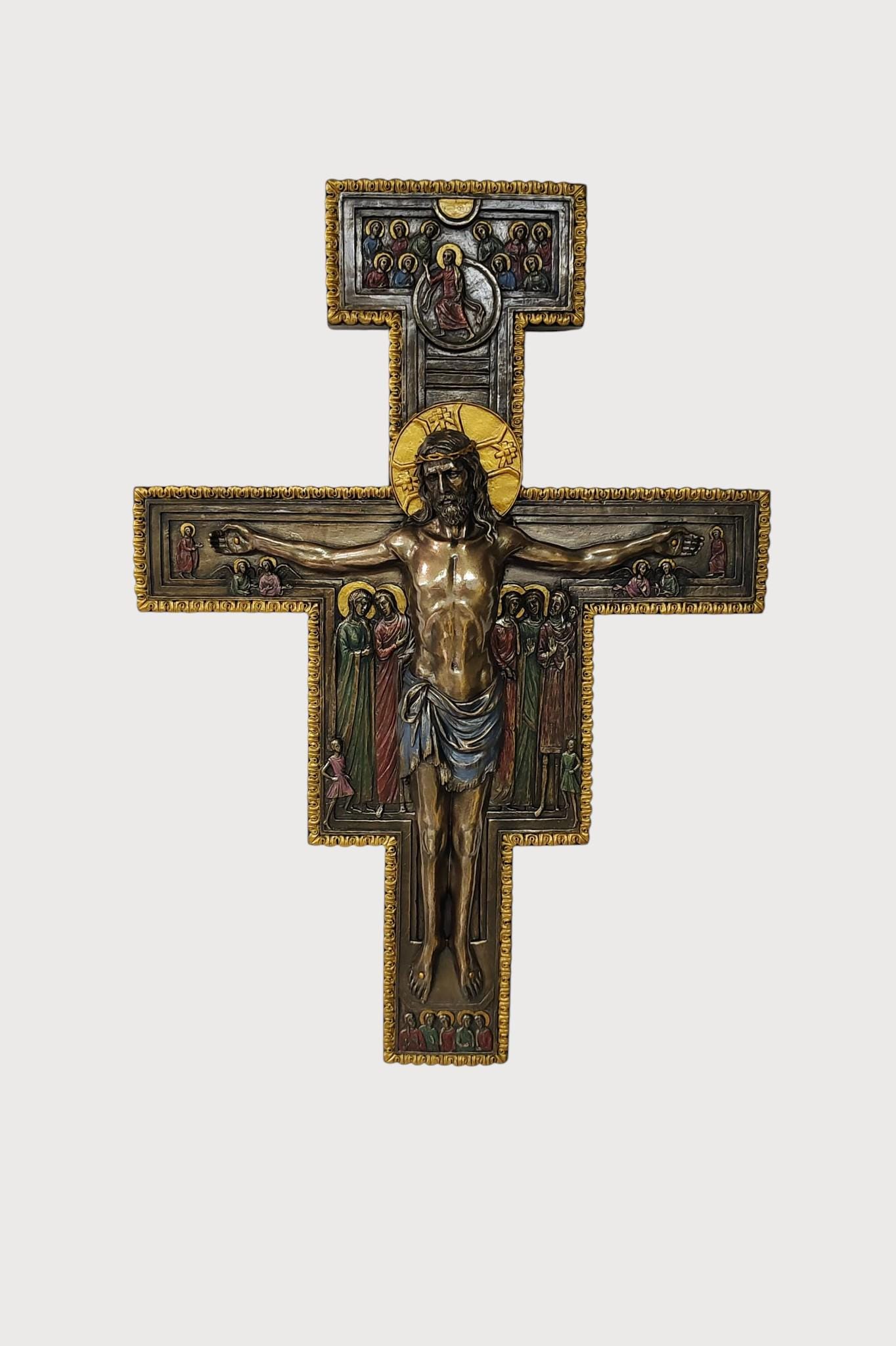Beautiful crucifix finished with a rich bronze coating. This detailed 40 cm (15.7") cross features intricate religious imagery and makes a meaningful spiritual home décor piece or gift. Size: 40×28 cm (15.7"×11"), weight 1.15 kg (2.54 lbs).